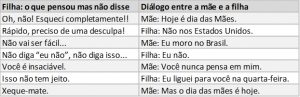 Quando estamos administrando uma conversa difícil, existem duas coisas a ponderar: o que você verbaliza durante a conversa e o que você pensa, mas não diz durante a conversa. Você acaba se censurando e não dizendo muita coisa durante o evento. Veja o exemplo abaixo que ilustra o querendo dizer: o diálogo é entre a filha e sua mãe. A coluna da esquerda é o que a filha pensou e sentiu, mas não disse para a mãe e, a coluna da direita, é a conversa entre as duas: